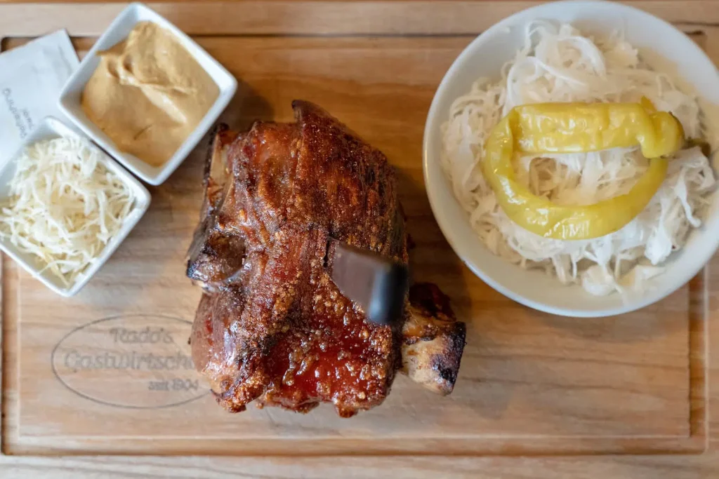 Eine weitere Spezialität unserer Familie ist die knusprige Stelze. Diese wird in unserem Hause klassisch mit Krautsalat, Ölpfefferoni, Senf, Hausbrot und frisch gerissenem Kren serviert.